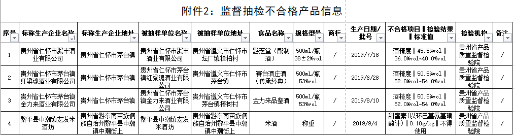 其中,標稱貴州省仁懷市茅台鎮紅粱魂酒業有限公司生産的賽台酒莊酒(傳承經典),酒精度不符合産品標簽標示值。標稱貴州省仁懷市茅台鎮金力來酒業有限公司生産的金力來品鑒酒,酒精度不符合産品標簽標示值。標稱貴州省仁懷市聚豐酒業有限公司生産的黔芝堂(配制酒),酒精度不符合産品標簽標示值。