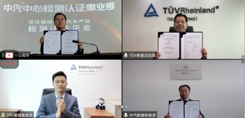 上海 -- (美國商業資訊) -- 2020年4月14日,德國萊茵TUV大中華區(以下簡稱“TUV萊茵”)與中汽中心檢測認證事業部中汽研汽車檢驗中心(天津)有限公司(以下簡稱“天檢中心”)、中汽數據有限公司(以下簡稱“中汽數據”)簽訂三方戰略合作備忘錄。TUV萊茵大中華區首席執行官兼總裁汪如順、交通服務副總裁黃余欣、天檢中心總經理周華、中汽數據總經理鄭繼虎及三方相關人員出席了在線簽約儀式。