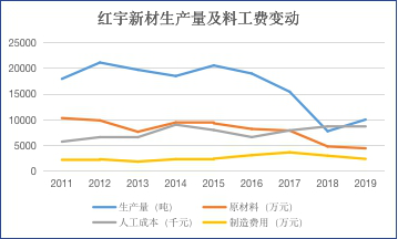 紅宇新材的營業成本構成中包括原材料、人工成本、制造費用和外協加工,其中原材料占總成本的比重在50%左右。伴隨生産量的下滑,紅宇新材的相關料工費成本與之背離。比如,2014年紅宇新材生産量下降6.48%,但是人工成本反而增加36.91%,制造費用同比增加25.46%;2018年紅宇新材生産量同比減少49.67%,原材料成本同比減少92.68%,但是人工成本卻同比增加9.83%;而在2019年,雖然生産量同比增長近3成,但是相應的原材料成本下降8%,人工成本沒有明顯變動,制造費用下降25.54%。