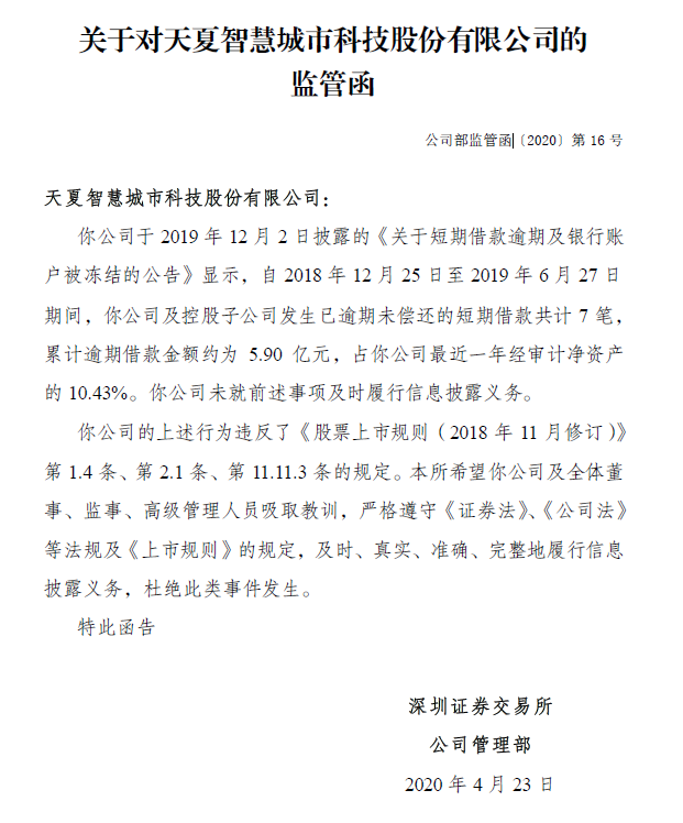 中國網財經4月24日訊 據深交所網站消息,深交所發布關于對天夏智慧城市科技股份有限公司(以下簡稱天夏智慧 證券代碼:000662)的監管函。