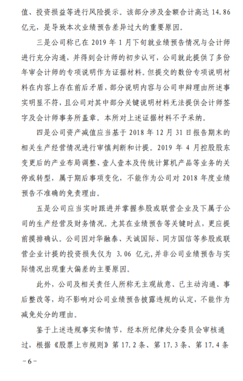 公司年度業績預告是投資者關注的重大事項,可能對公司股票價格及投資者決策産生重大影響。公司理應根據會計准則要求,充分、審慎地評估當期投資損益、存貨跌價准備、資産減值等,確保預告業績的准確性。但公司預告的業績與實際業績狀況出現巨大偏差,差異金額巨大,歸屬于上市公司股東的淨利潤差額達21.6億元,差異幅度達125%,情節嚴重;同時,公司未在業績預告中對可能導致業績預告不准確的事項進行充分、明確的風險提示。此外,公司也未及時對業績預告進行更正,遲至2019年4月25日才發布業績更正公告,更正信息披露不及時。