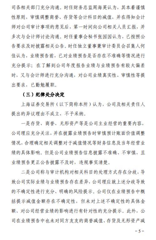 公司業績預告不准確,與實際業績相比差異絕對值巨大,且公司業績預告更正公告信息披露不及時。上述行為違反了《上海證券交易所股票上市規則》(以下簡稱《股票上市規則》)第2.1條、第2.6條、第11.3.3條等有關規定。時任董事長周立業作為公司主要負責人和信息披露第一責任人、時任總裁黃俞作為公司經營管理主要人員、時任財務總監周海英作為財務負責人、時任董事會秘書張園園作為具體信息披露具體事務負責人、時任獨立董事兼審計委員會召集人何佳作為財務會計事項的主要督導人員,未能勤勉盡責,對公司的違規行為負有責任,其行為嚴重違反了《股票上市規則》第2.2條、第3.1.4條、第3.1.5條、第3.2.2條的規定及其在《董事(監事、高級管理人員)聲明及承諾書》中做出的承諾。