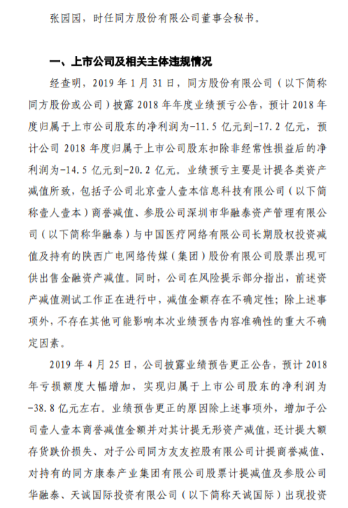 2019年4月25日,公司披露業績預告更正公告,預計2018年虧損額度大幅增加,實現歸屬于上市公司股東的淨利潤為-38.8億元左右。業績預告更正的原因除上述事項外,增加子公司壹人壹本商譽減值金額並對其計提無形資産減值,還計提大額存貨跌價損失、對子公司同方友友控股有限公司計提商譽減值、對持有的同方康泰産業集團有限公司股票計提減值及參股公司華融泰、天誠國際投資有限公司(以下簡稱天誠國際)出現投資虧損等。2019年4月26日,公司披露2018年年度報告,公司2018年度歸屬于上市公司股東的淨利潤為-38.8億元。