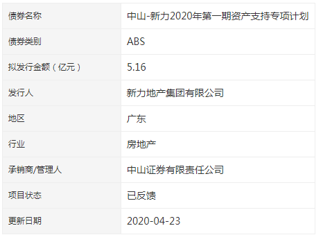 債券類别為ABS,擬發行金額5.16億元,發行人為新力地產集團有限公司,承銷商/管理人為中山證券有限責任公司。