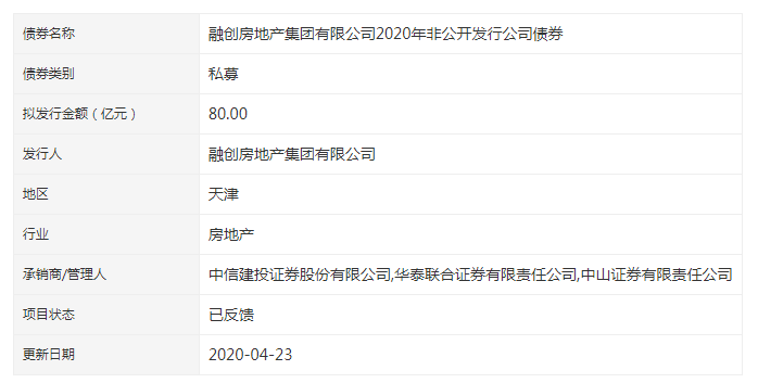 債券類别為私募,擬發行金額80億元,發行人為融創房地產集團有限公司,承銷商/管理人為中信建投證券股份有限公司,華泰聯合證券有限責任公司,中山證券有限責任公司。