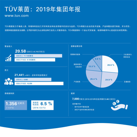德國科隆--(BUSINESS WIRE)--(美國商業資訊)--德國萊茵TUV集團(以下簡稱“TUV萊茵”)在2019財年實現持續增長:去年,營業收入首次突破20億歐元大關,達到20.85億歐元,較上一財年增加了8700萬歐元,增幅為4.4%。息稅前利潤(EBIT)為1.356億歐元,略低于2018年的1.375億歐元。2019財年的息稅前利潤率為6.5%。全球員工人數增加,2019年全年平均全職員工達到21,441名,較前一年度增加了991人,增幅為4.8%。投資總額達到7000萬歐元。