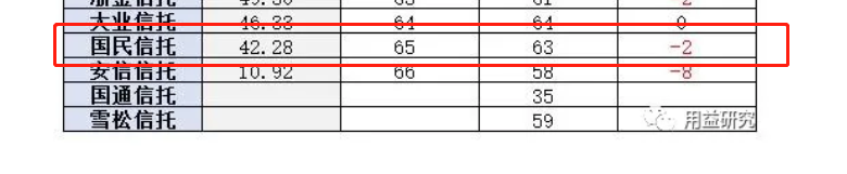中國網財經在對比其它信托公司數據時發現,國民信托在信托資産、總資産、固有資産、注冊資本、清算收益等指標,除信托資産規模排名行業已公布數據第31位外,其與指標均處行業60位左右,排名較後。而根據用益研究最新公布信托公司綜合實力排名來看,國民信托僅以42.28總得分排名已公布業績數據公司倒數第二位。