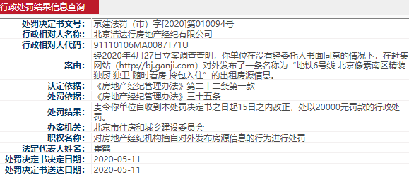 處罰信息顯示,北京浩達行房地産經紀有限公司在沒有經委托人書面同意的情況下,在趕集網站對外發布了一條名稱為“地鐵6號線 北京像素南區精裝 獨廚 獨衛 隨時看房 拎包入住”的出租房源信息。