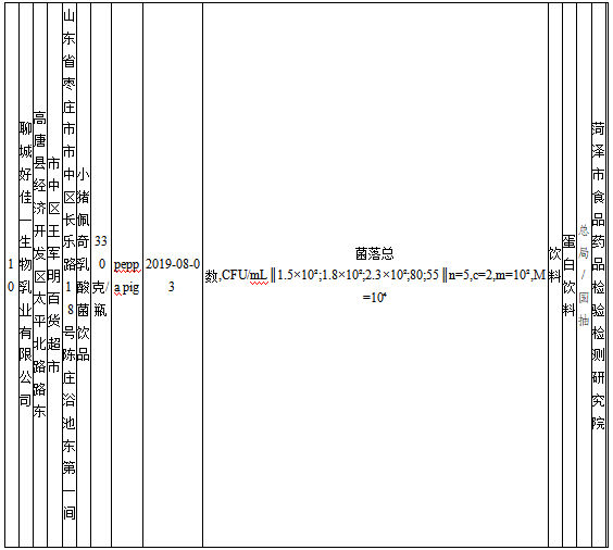 通告顯示,棗莊市市中區王軍明百貨超市銷售的標示生産企業為聊城好佳一生物乳業有限公司生産的1批次小豬佩奇乳酸菌飲品中菌落總數項目不合格。