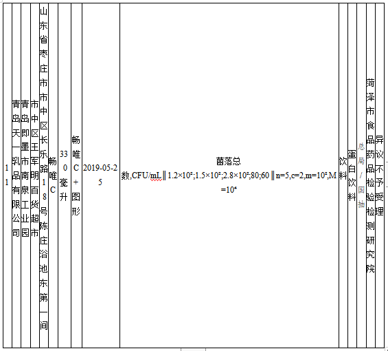 11青島天一乳品有限公司 青島即墨市南泉工業園 市中區王軍明百貨超市 山東省棗莊市市中區長樂路18號陳莊浴池東第一間 暢唯C 330毫升 暢唯C+圖形 2019-05-25菌落總數,CFU/mL║1.2×10²;1.5×10²;2.8×10²;80;60║n=5,c=2,m=10²,M=10⁴飲料 蛋白飲料總局/國抽菏澤市食品藥品檢驗檢測研究院異議不予受理。