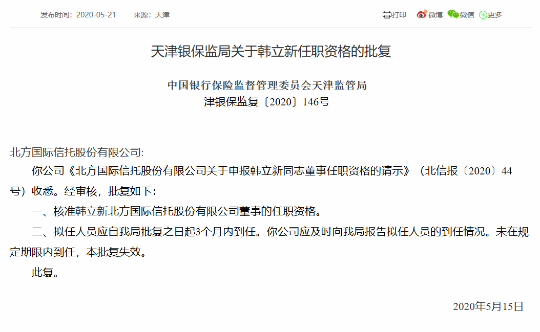 中國網財經5月22日訊(記者 常實 鹿凱)昨日,銀保監會官網披露,北方國際信托股份有限公司關于申報韓立新同志董事任職資格請示,被天津銀保監局核准。不久前,韓立新已被推舉為新任董事長人選。