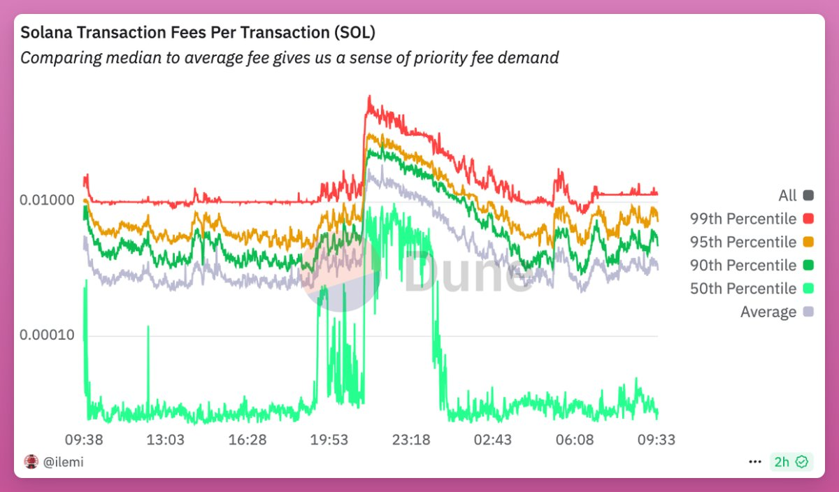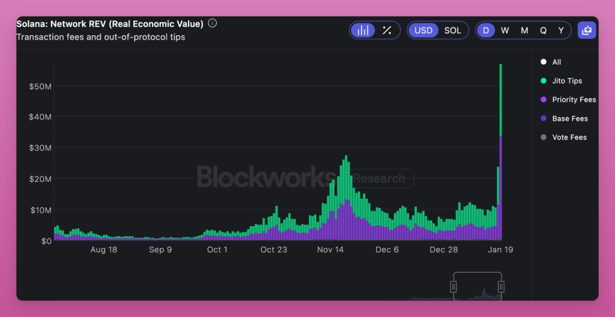 总共支付了 5700 万美元的费用,但大部分是 3300 万美元的优先费和 2350 万美元的 Jito Tips(Jito 验证小费)。
