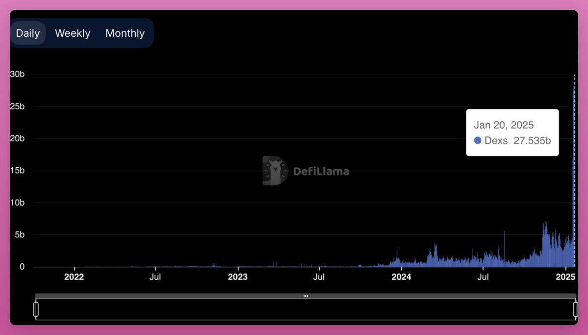 Solana 上的 DEX 交易量从平均约 50 亿美元跃升至 270 亿美元,增长了 5.4 倍。