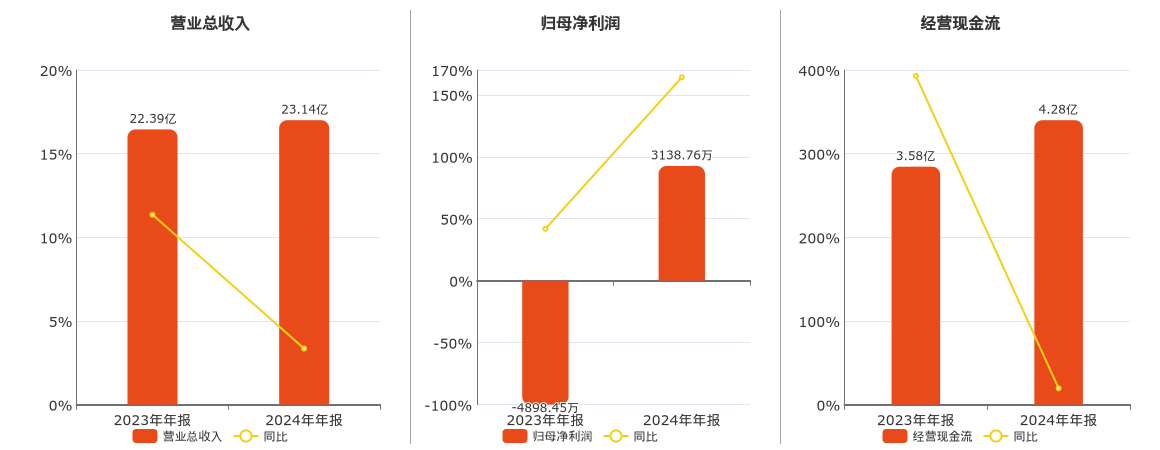 公司營業總收入為23.14億元,較去年同報告期營業總收入增加7498.12萬元,實現5年連續上漲,同比較去年同期上漲3.35%。歸母淨利潤為3138.76萬元,較去年同報告期歸母淨利潤增加8037.21萬元,實現2年連續上漲。經營活動現金淨流入為4.28億元,較去年同報告期經營活動現金淨流入增加6994.00萬元,實現3年連續上漲,同比較去年同期上漲19.54%。