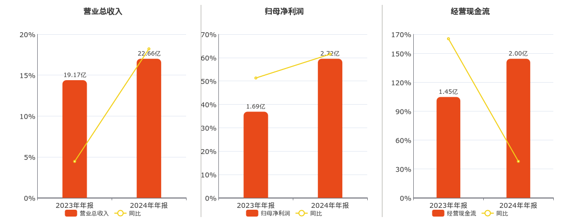 公司營業總收入為22.66億元,較去年同報告期營業總收入增加3.49億元,實現5年連續上漲,同比較去年同期上漲18.21%。歸母淨利潤為2.72億元,較去年同報告期歸母淨利潤增加1.04億元,實現2年連續上漲,同比較去年同期上漲61.46%。經營活動現金淨流入為2.00億元,較去年同報告期經營活動現金淨流入增加5506.48萬元,實現3年連續上漲,同比較去年同期上漲37.91%。