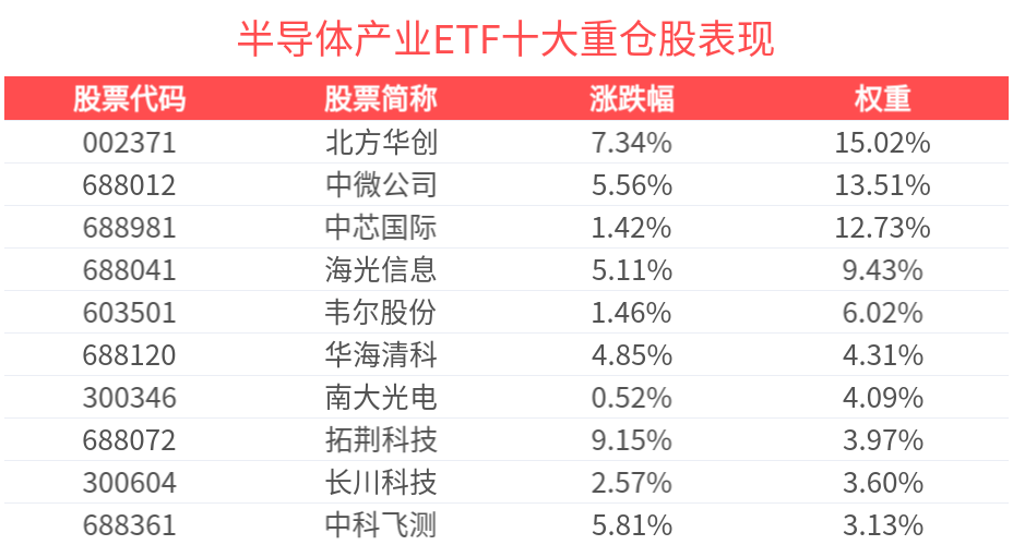 數據顯示,截至2025年2月28日,中證半導體産業指數(931865)前十大權重股分別為北方華創(002371)、中微公司(688012)、中芯國際(688981)、海光信息(688041)、韋爾股份(603501)、拓荊科技(688072)、華海清科(688120)、南大光電(300346)、長川科技(300604)、中科飛測(688361),前十大權重股合計佔比76.69%。