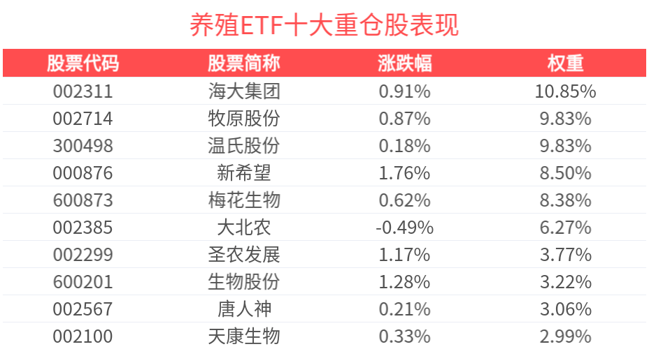 數據顯示,截至2025年2月28日,中證畜牧養殖指數(930707)前十大權重股分別為海大集團(002311)、溫氏股份(300498)、牧原股份(002714)、新希望(000876)、梅花生物(600873)、大北農(002385)、聖農發展(002299)、生物股份(600201)、唐人神(002567)、天康生物(002100),前十大權重股合計佔比69.16%。