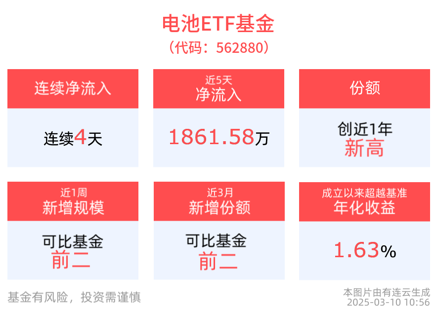 從資金淨流入方面來看,電池ETF基金近4天獲得連續資金淨流入,最高單日獲得1217.54萬元淨流入,合計「吸金」2275.78萬元,日均淨流入達568.95萬元。