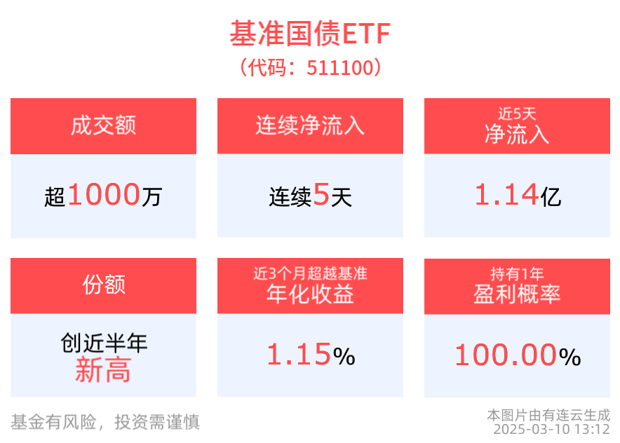 截至2025年3月10日 13:12,基準國債ETF(511100)上漲0.02%,最新價報107.78元,盤中成交額已達1847.05萬元,換手率3.6%。拉長時間看,截至2025年3月7日,基準國債ETF近3月累計上漲1.28%。