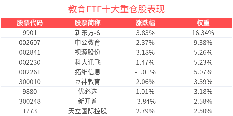 數據顯示,截至2025年2月28日,中證全球中國教育主題指數(931456)前十大權重股分別為好未來(TAL)、新東方-S(09901)、中公教育(002607)、拓維信息(002261)、視源股份(002841)、科大訊飛(002230)、優必選(09880)、豆神教育(300010)、新開普(300248)、天立國際控股(01773),前十大權重股合計佔比70.64%。