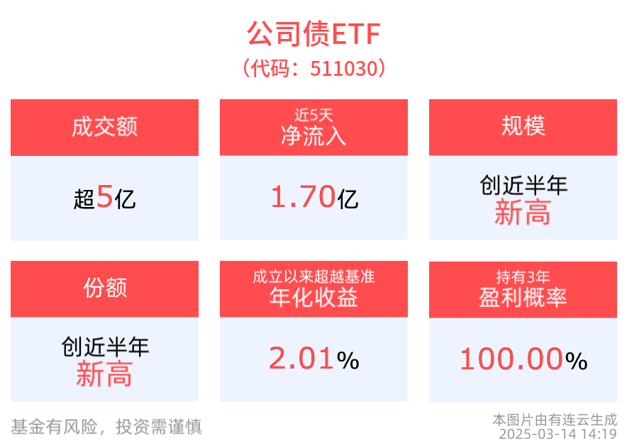 拉長時間看,截至2025年3月13日,公司債ETF近1年累計上漲2.39%。規模方面,公司債ETF最新規模達112.28億元,創近半年新高。份額方面,公司債ETF最新份額達10.70億份,創近半年新高。資金流入方面,公司債ETF最新資金淨流入1.63億元。拉長時間看,近5個交易日内,合計「吸金」1.70億元。