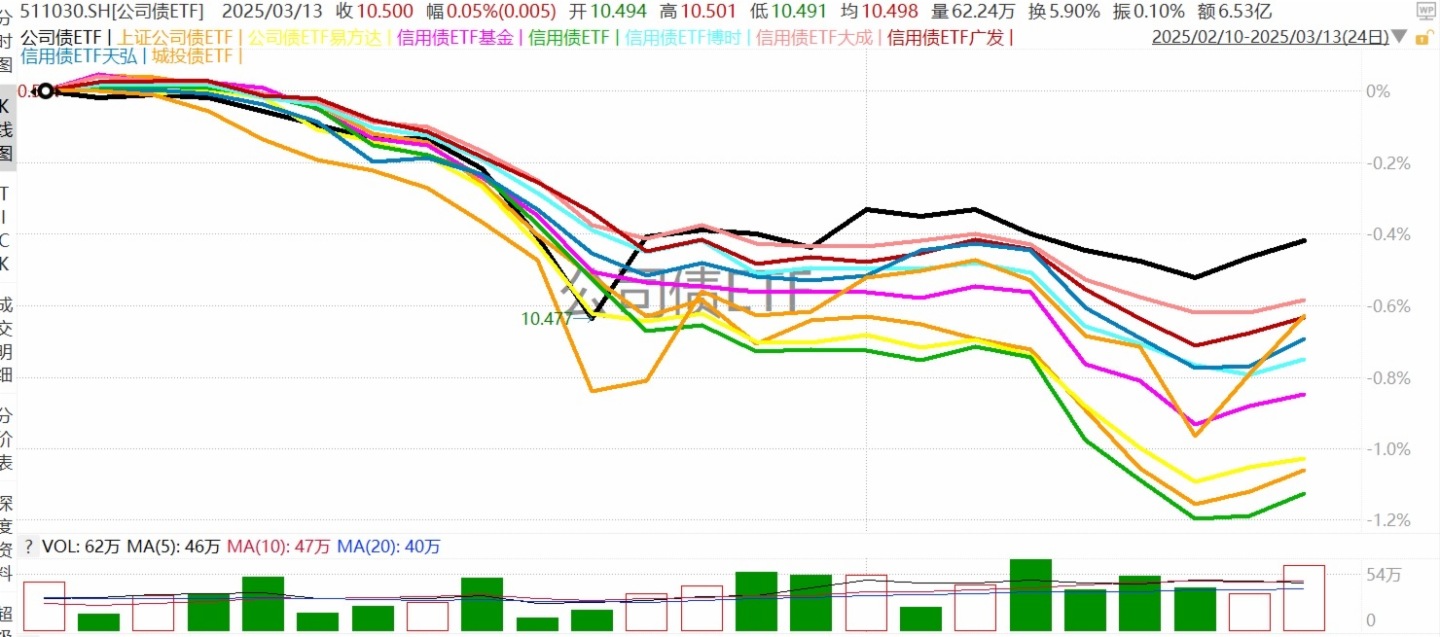 截至2025年3月14日 14:19,公司債ETF(511030)多空膠著,最新報價10.5元,盤中成交額已達5.16億元,換手率4.6%。