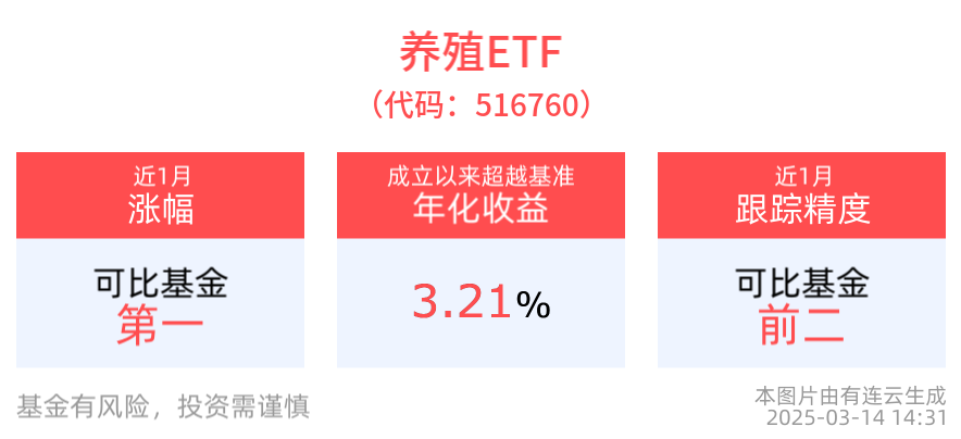 拉長時間看,截至2025年3月13日,養殖ETF近1周累計上漲2.38%,漲幅排名可比基金1/4。