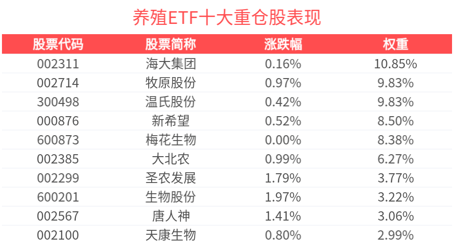 數據顯示,截至2025年2月28日,中證畜牧養殖指數(930707)前十大權重股分別為海大集團(002311)、溫氏股份(300498)、牧原股份(002714)、新希望(000876)、梅花生物(600873)、大北農(002385)、聖農發展(002299)、生物股份(600201)、唐人神(002567)、天康生物(002100),前十大權重股合計佔比69.16%。