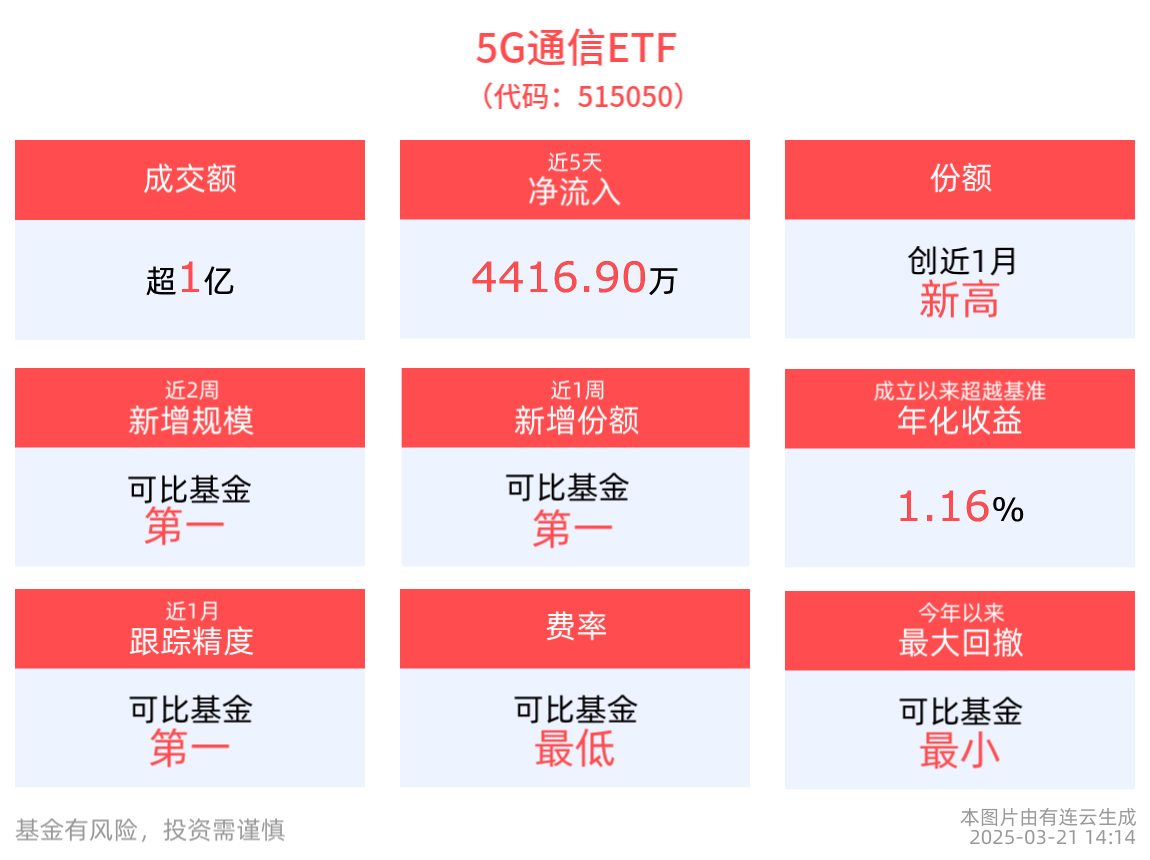 通信板塊回調,5G通信ETF(515050)近5個交易日淨流入4416.90萬元