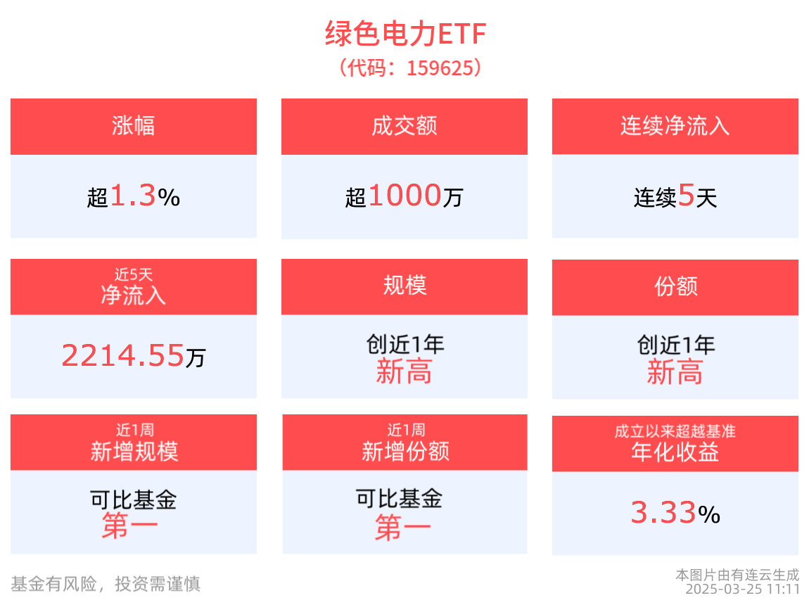 從資金淨流入方面來看,綠色電力ETF近5天獲得連續資金淨流入,最高單日獲得711.12萬元淨流入,合計「吸金」2214.55萬元。