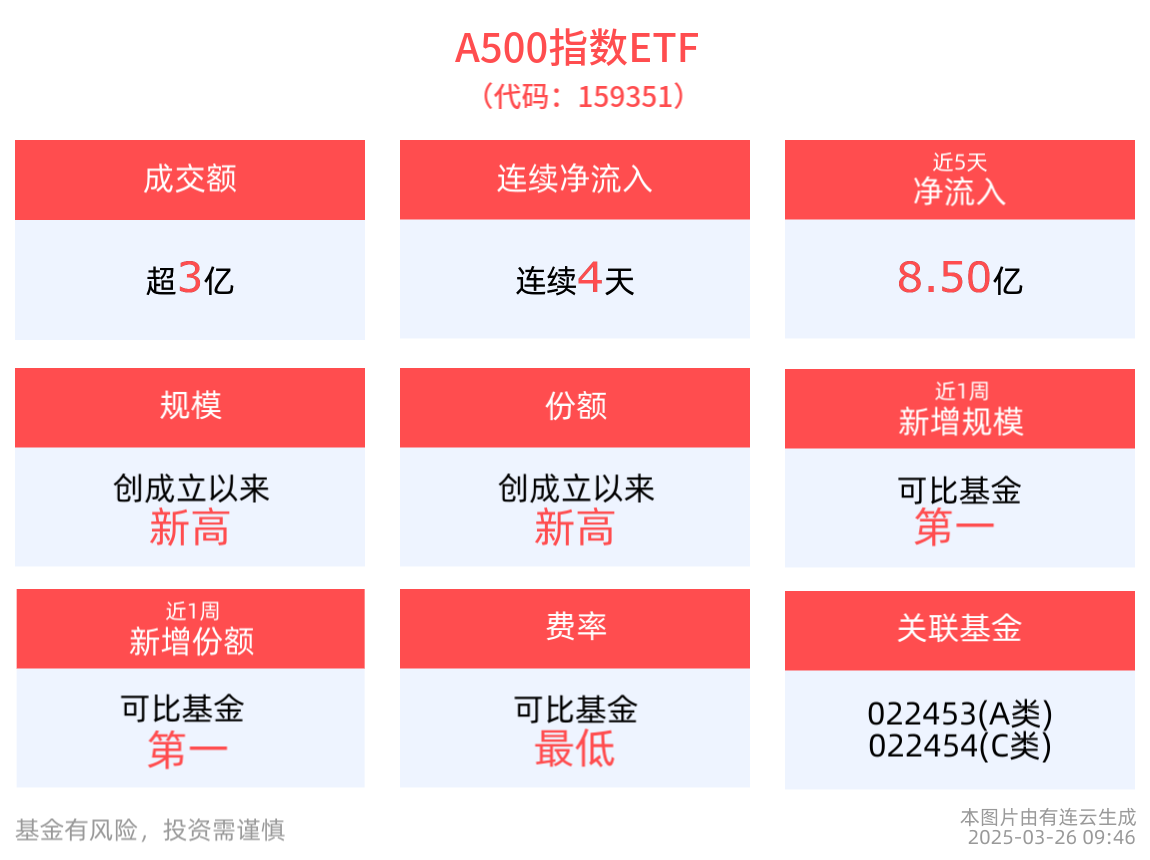 規模方面,A500指數ETF最新規模達147.86億元,創成立以來新高。份額方面,A500指數ETF最新份額達149.90億份,創成立以來新高。