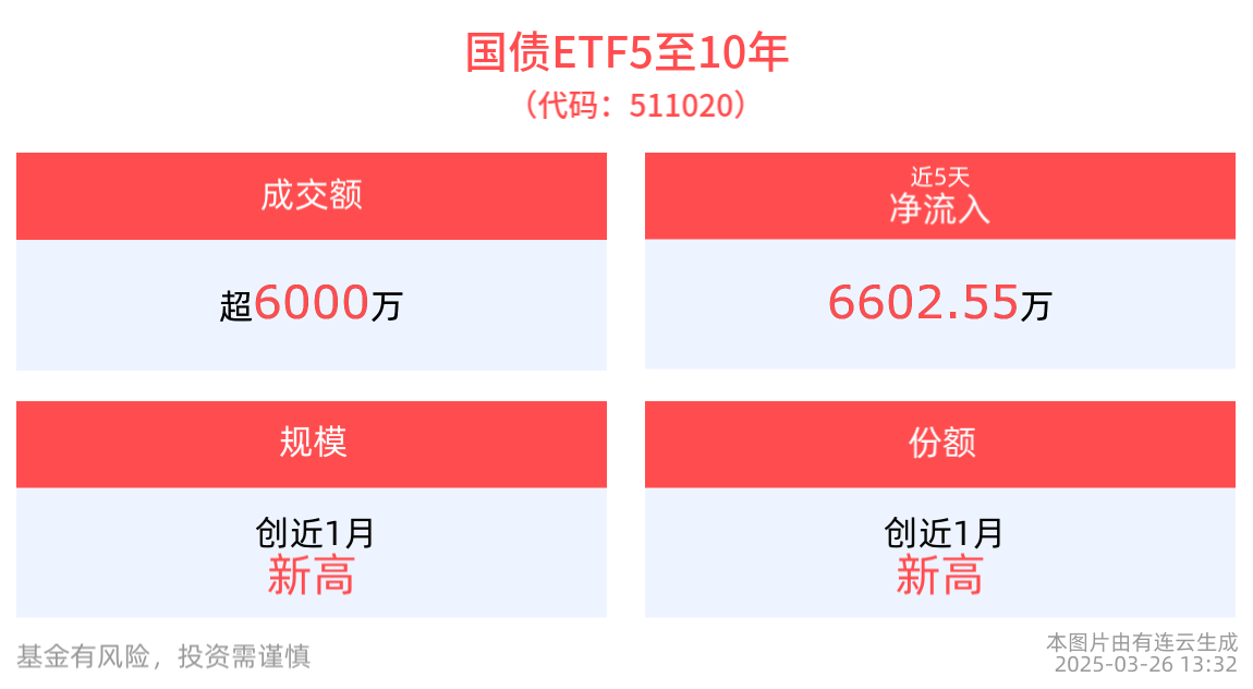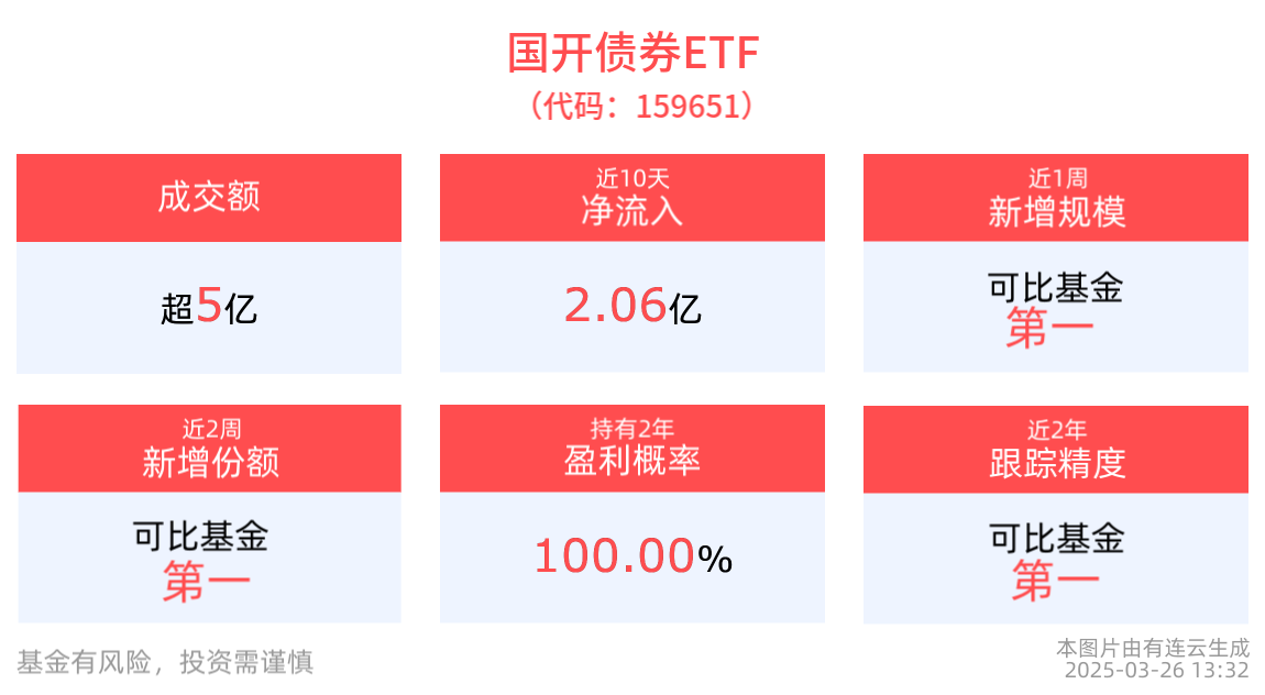 拉長時間看,截至2025年3月25日,公司債ETF近1周累計上漲0.24%。國開債券ETF近1年累計上漲2.19%。國債ETF5至10年近1周累計上漲0.52%。