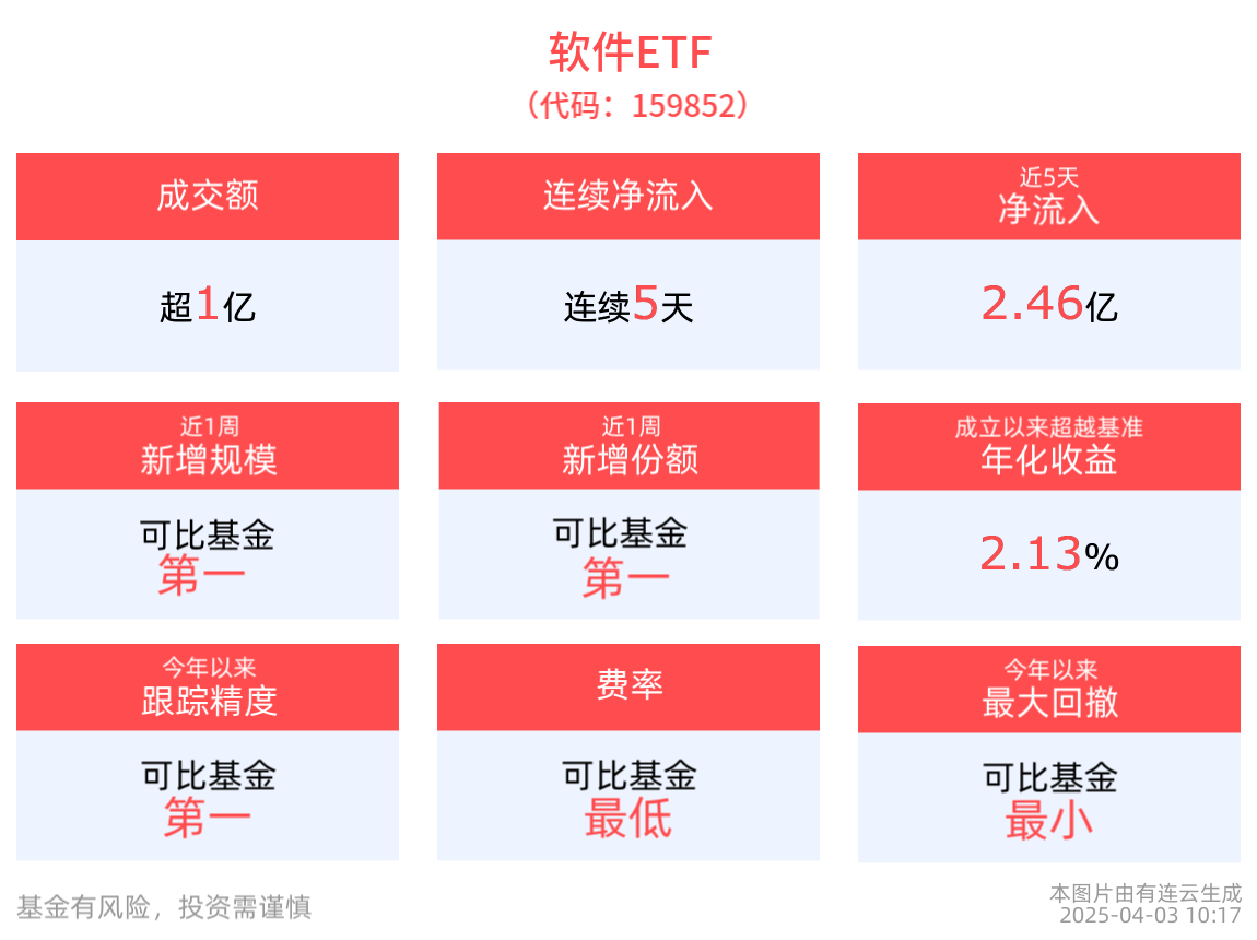 拉长时间看,截至2025年4月2日,软件ETF近3月累计上涨11.60%。规模方面,软件ETF近1周规模增长1.78亿元,实现显著增长。份额方面,软件ETF近1周份额增长2.89亿份,实现显著增长。