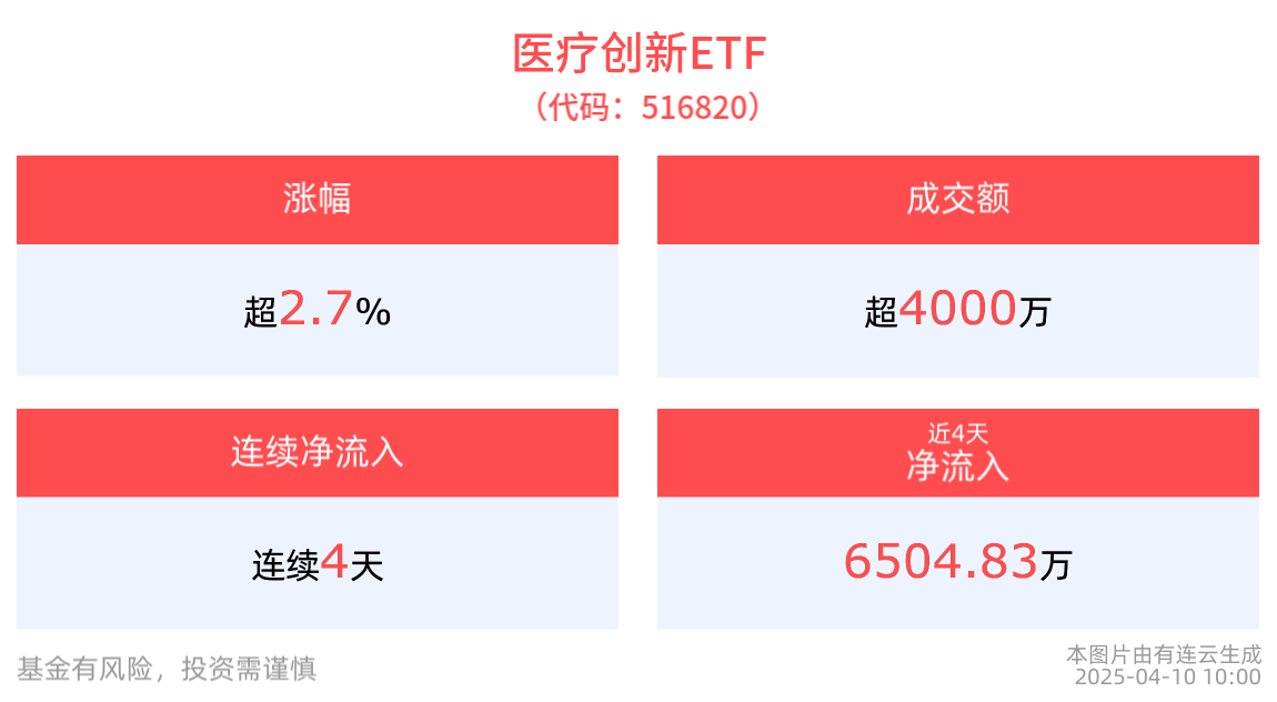 截至2025年4月10日 10:00,中證醫藥及醫療器械創新指數(931484)強勢上漲2.66%,成分股艾力斯(688578)上漲6.70%,百利天恒(688506)上漲6.53%,海思科(002653)上漲5.90%,心脈醫療(688016),神州細胞(688520)等個股跟漲。醫療創新ETF(516820)上漲2.75%,最新價報0.34元。拉長時間看,截至2025年4月9日,醫療創新ETF近3月累計上漲3.15%。