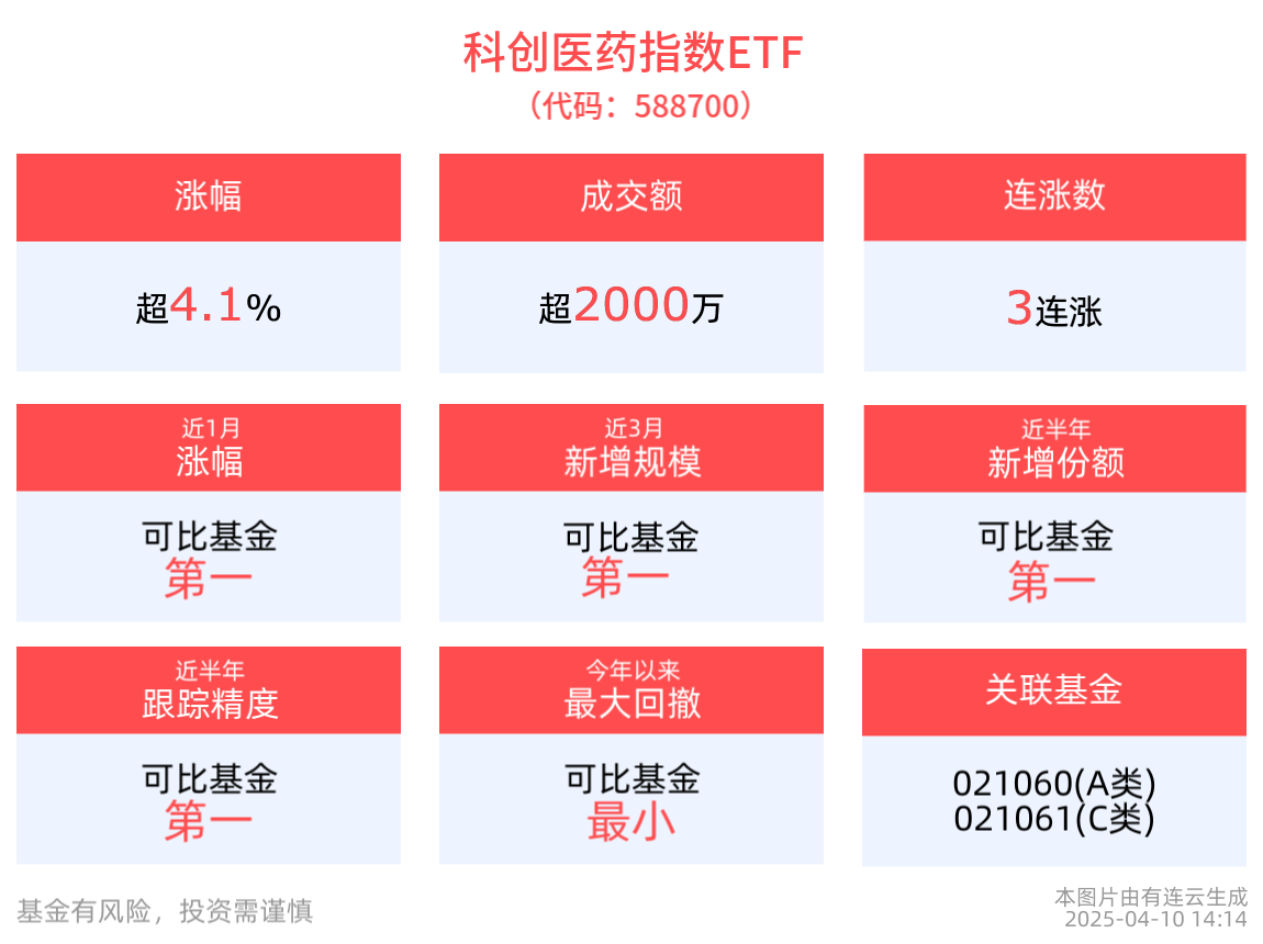 截至2025年4月10日 14:14,上證科創板生物醫藥指數強勢上漲3.99%,成分股益方生物上漲11.95%,榮昌生物上漲11.82%,澤璟制藥上漲9.95%,智翔金泰、百奧泰等個股跟漲。科創醫藥指數ETF(588700)上漲4.18%, 沖擊3連漲。
