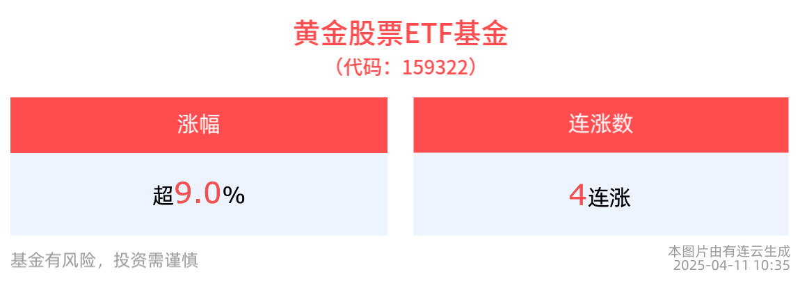 截至2025年4月11日 10:35,中證滬深港黃金産業股票指數(931238)強勢上漲3.76%,成分股中國黃金國際(02099)上漲9.15%,赤峰黃金(600988)上漲8.55%,四川黃金(001337)上漲7.96%,潮宏基(002345),曉程科技(300139)等個股跟漲。黃金股票ETF基金(159322)上漲9.01%, 沖擊4連漲。最新價報1.08元。拉長時間看,截至2025年4月10日,黃金股票ETF基金近3月累計上漲7.39%。
