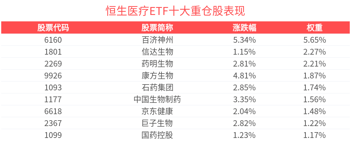 數據顯示,截至2025年4月11日,恒生醫療保健指數(HSHCI)前十大權重股分別為百濟神州(06160)、藥明生物(02269)、信達生物(01801)、康方生物(09926)、石藥集團(01093)、京東健康(06618)、中國生物制藥(01177)、巨子生物(02367)、阿裡健康(00241)、翰森制藥(03692),前十大權重股合計佔比56.37%。
