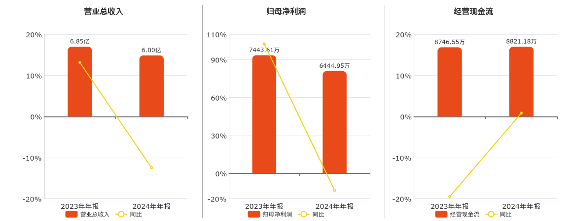 公司營業總收入為6.00億元,在已披露的同業公司中排名第15,較去年同報告期營業總收入減少8533.54萬元,同比較去年同期下降12.46%。歸母淨利潤為6444.95萬元,在已披露的同業公司中排名第12,較去年同報告期歸母淨利潤減少998.66萬元,同比較去年同期下降13.42%。經營活動現金淨流入為8821.18萬元,在已披露的同業公司中排名第11。