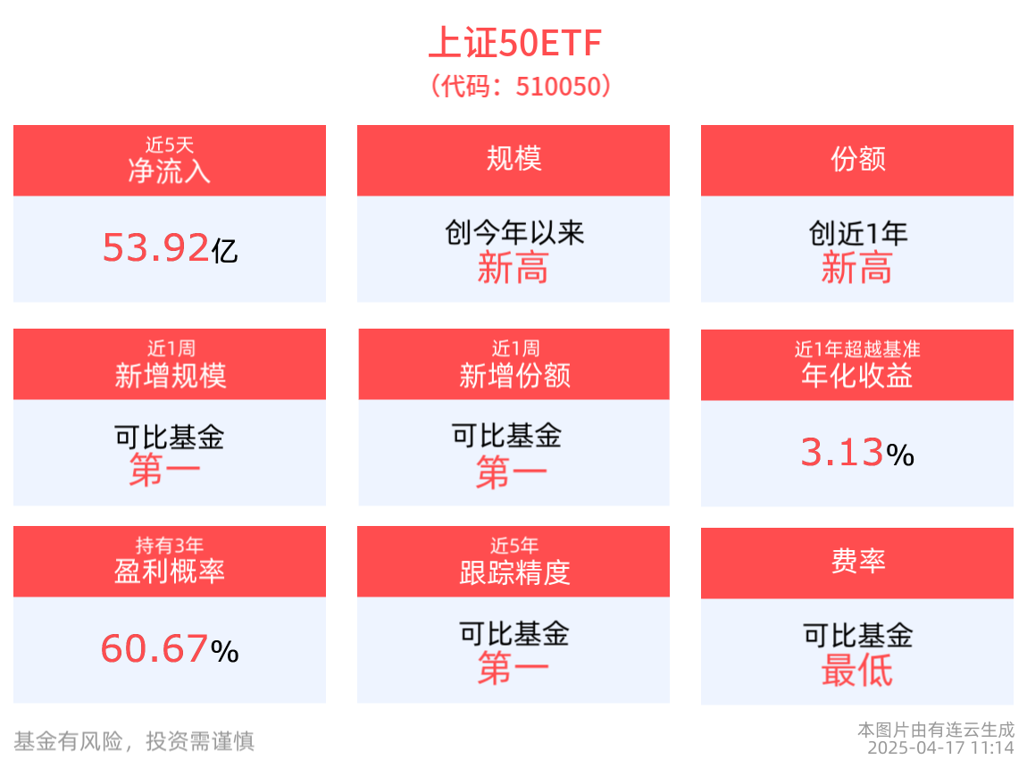 資金流入方面,上證50ETF昨日單日獲資金淨流入39.36億元,近5個交易日内有3日資金淨流入,合計「吸金」53.92億元。