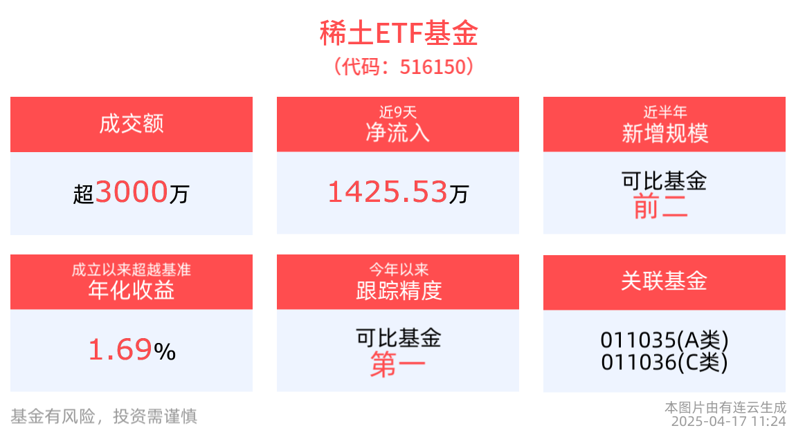流動性方面,稀土ETF基金盤中換手2.3%,成交3793.28萬元。規模方面,稀土ETF基金近半年規模增長1.63億元,實現顯著增長。資金流入方面,拉長時間看,稀土ETF基金近9個交易日内,合計「吸金」1425.53萬元。