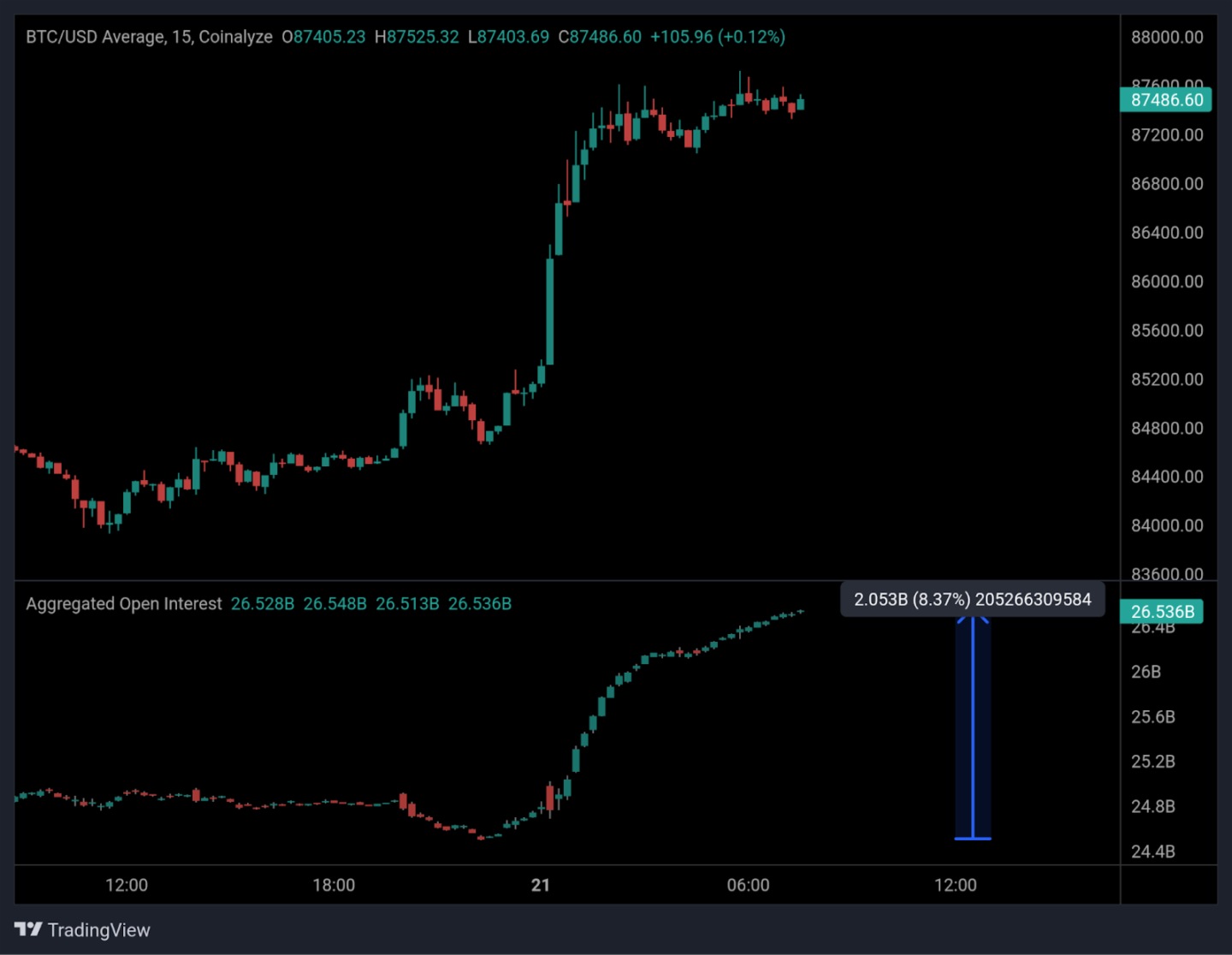 過去一天未平倉合約增加了 20 多億美元,相當於百分比增幅超過 8.3%。這裡的「未平倉合約量」是指衡量所有衍生品交易所當前未平倉的 BTC 相關頭寸總量的指標。