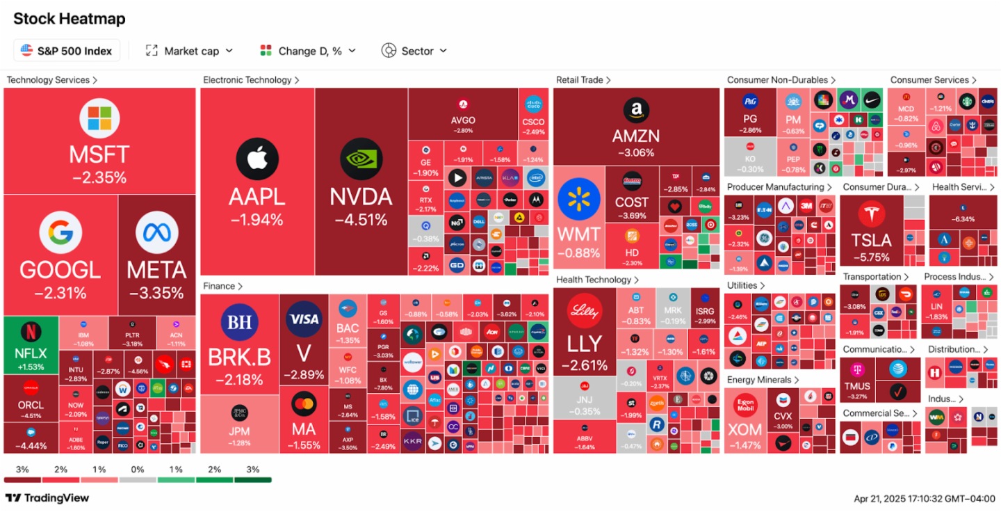 2025 年 4 月 21 日,全球金融市場迎來「黑色星期一」。美國三大股指集體崩盤:道瓊斯工業指數暴跌 972 點(跌幅 2.8%),標普 500 指數重挫 125 點(跌幅 3.1%),納斯達克綜合指數更因科技股抛售潮狂瀉 416 點(跌幅 4.2%),單日市值蒸發 1.5 萬億美元。