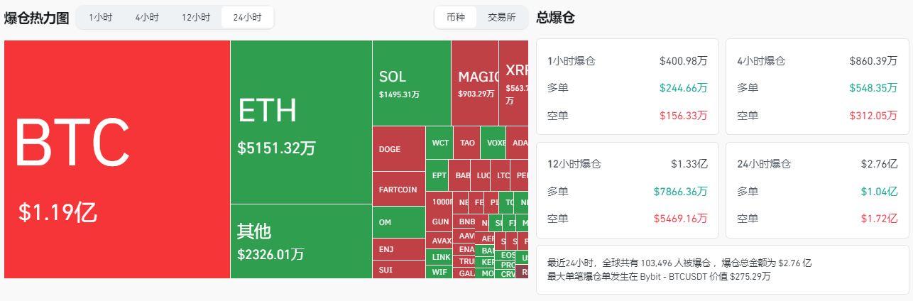 最近 24 小時,全球共有 103,496 人被爆倉 ,爆倉總金額為 $2.76 億。當前從情緒指標來看,比特幣已從過去兩周的恐慌情緒中走出。