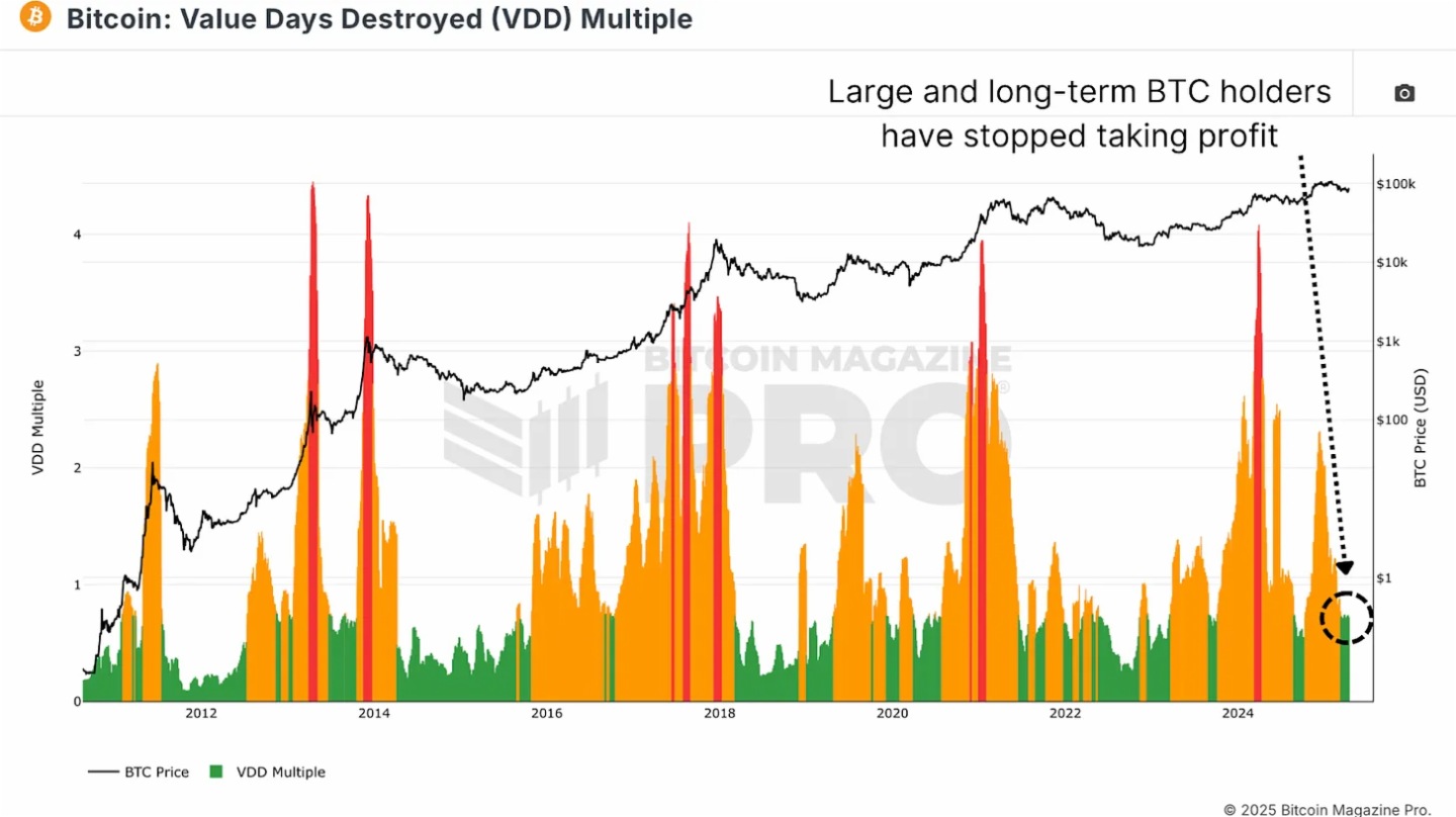 另一个关键指标是价值天数销毁(Value Days Destroyed,简称 VDD)倍数。该指标通过比特币在交易前的持有时间进行加权,衡量其链上转移速度。当该倍数飙升时,通常意味着经验丰富的持有者正在获利了结;若长期处于低位,则可能表明市场处于积累阶段。