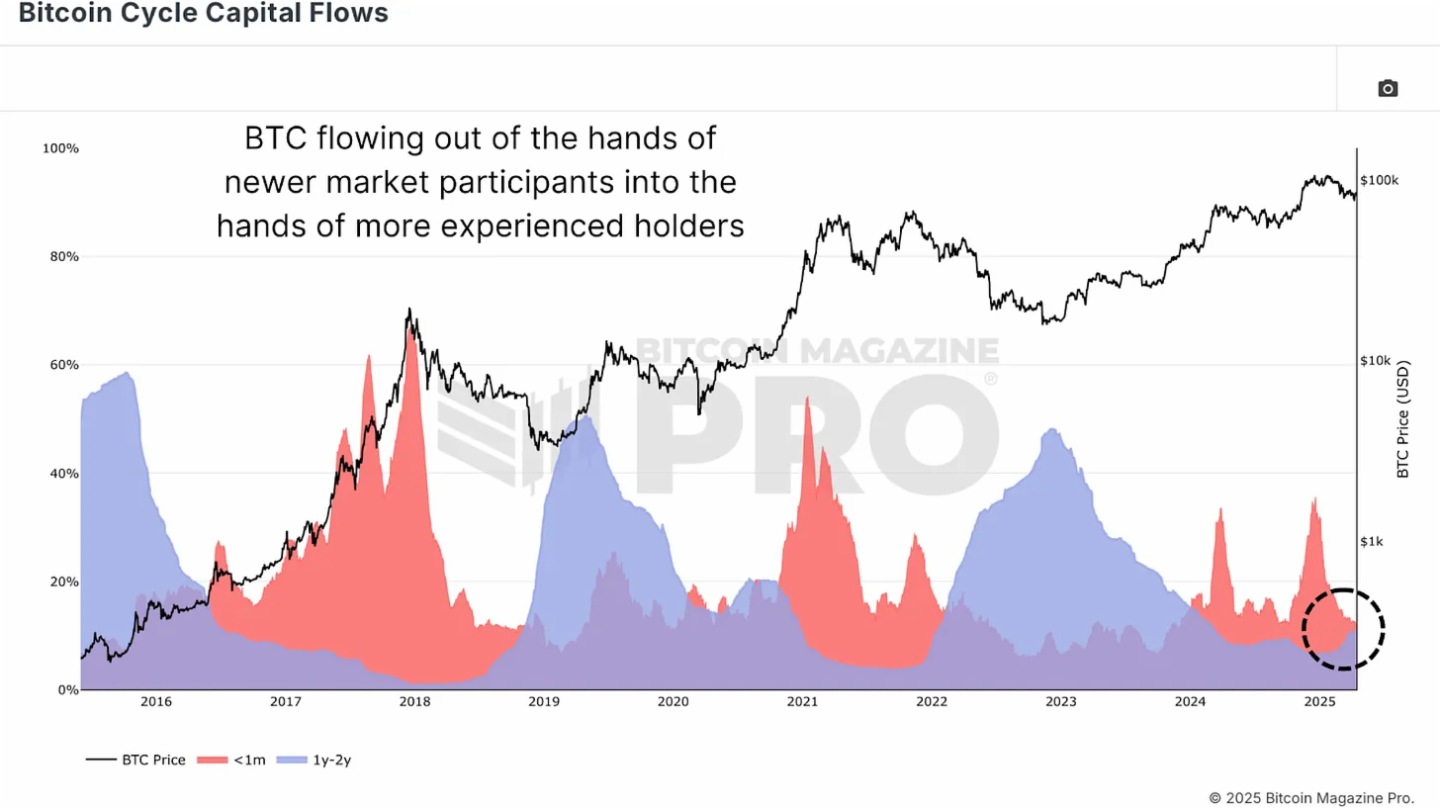 图 3:比特币周期资本流动图表展示了 BTC 正回流到更有经验的持有者手中