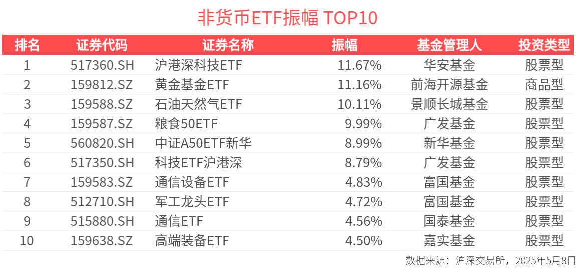 截至今日收盤,滬港深科技ETF、黃金基金ETF、石油天然氣ETF振幅居市場前列,分別達11.67%、11.16%、10.11%。