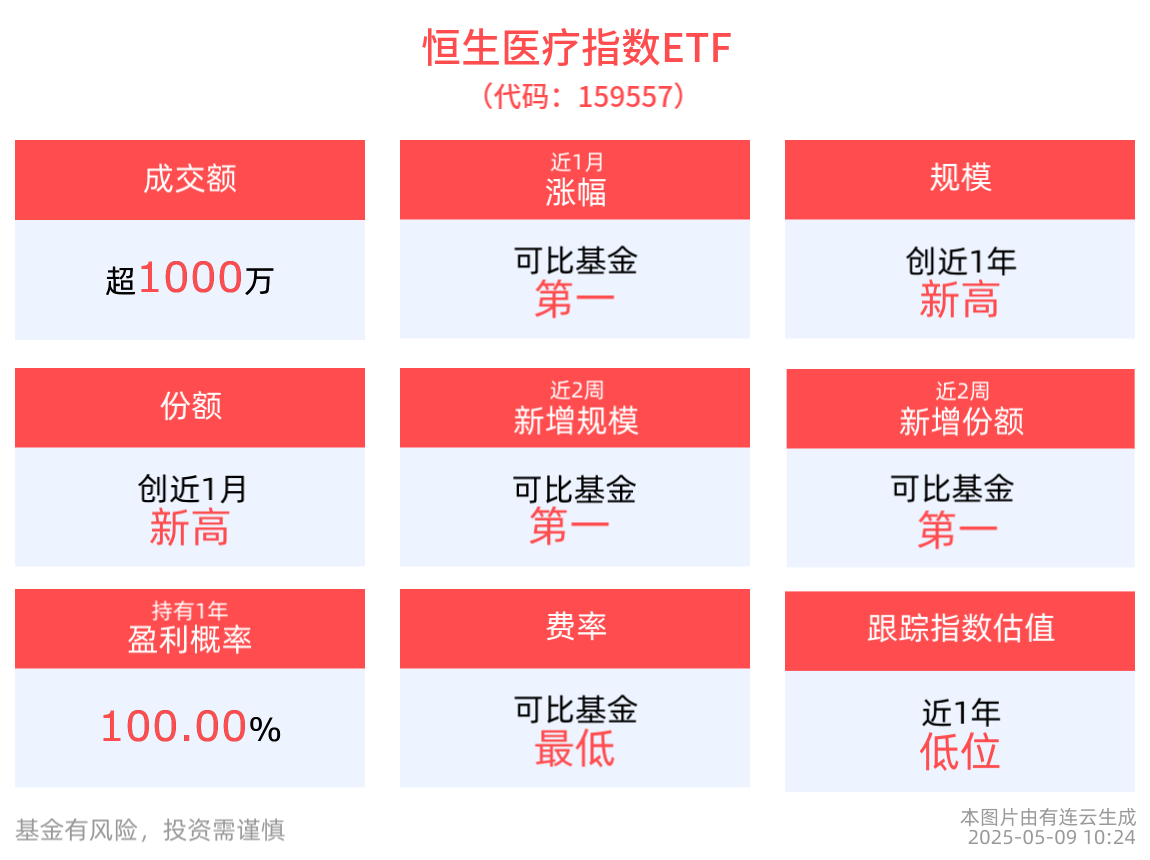 截至2025年5月9日 10:24,恒生醫療保健指數上漲0.33%,成分股再鼎醫藥上漲7.38%,遠大醫藥上漲3.23%,三生制藥上漲2.94%,巨子生物上漲2.53%,微創機器人-B上漲1.61%。恒生醫療指數ETF(159557)上漲0.83%。拉長時間看,截至2025年5月8日,恒生醫療指數ETF近1月累計上漲16.06%,漲幅排名可比基金首位。