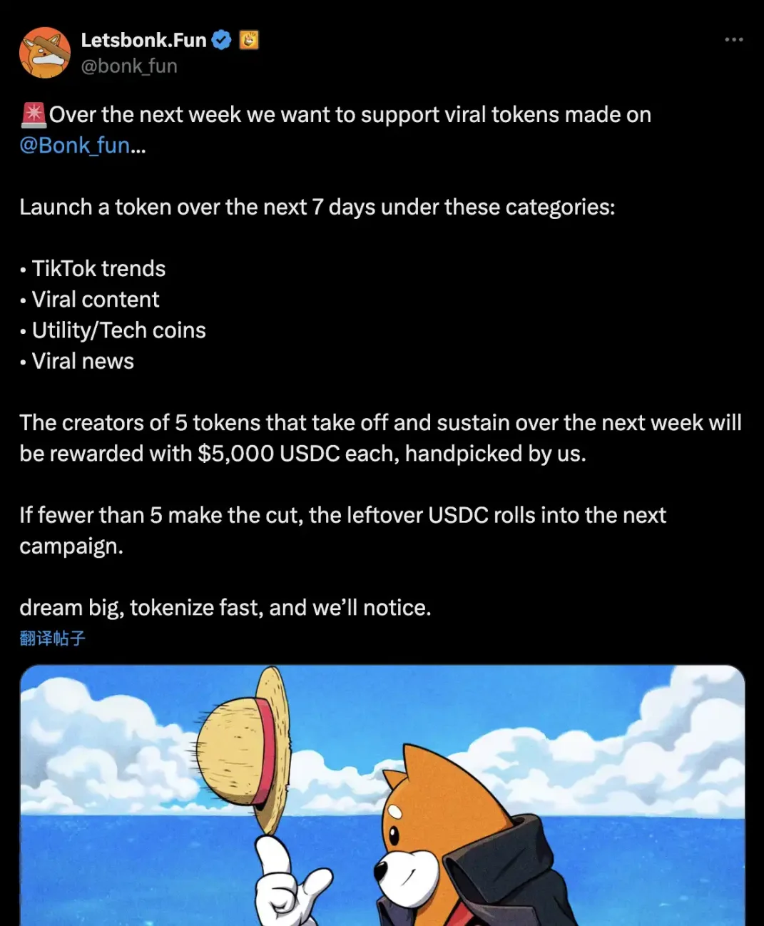自從 5 月 11 日 BONKFUN 發佈接下來一周對 5 個「起飛」代幣提供 5000 美元的獎勵,周邊成員便開始瘋狂支持各種 Meme 的社區,也有大量華語 KOL 玩家與其聯動,也因此出現許多「中文」敘事在 BONKFUN 的主頁。