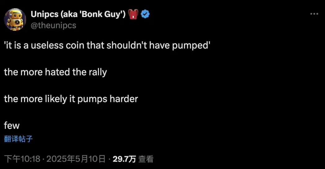 USELESS 來自 BONKGUY 在 X 上發佈的一則推文「這是一種無用的貨幣,不應該被推高」,這種類似於「FARTCOIN」、「SHIT」、「HOUSECOIN」等虛無情緒化概念是歐美社區的鐘愛,而自 BONK 發射之後市值一路狂飙至 3400 萬美元也讓人仿佛看到了「HOUSECOIN」同樣的路徑。