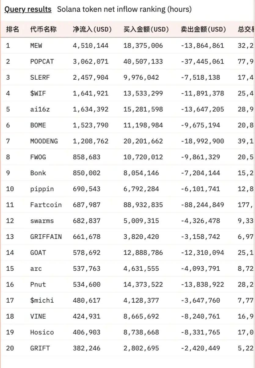 可以得知,近期流入量排名前段的代幣幾乎都是發射天數超過 150 天的老幣,MEW、POPCAT、SLERF、WIF 等更老牌 Memecoins 佔據大部分的流入量,而由近期放出發射平台 autofun 的 ai16z 為首的 AI 概念則佔據另一部分流動性,一部分原因是前段時間的超跌的影響,另一方面是 Crypto 並未出現新的 AI 概念,因此成熟的 AI 項目也被聰明錢列為抄底的對象之一。